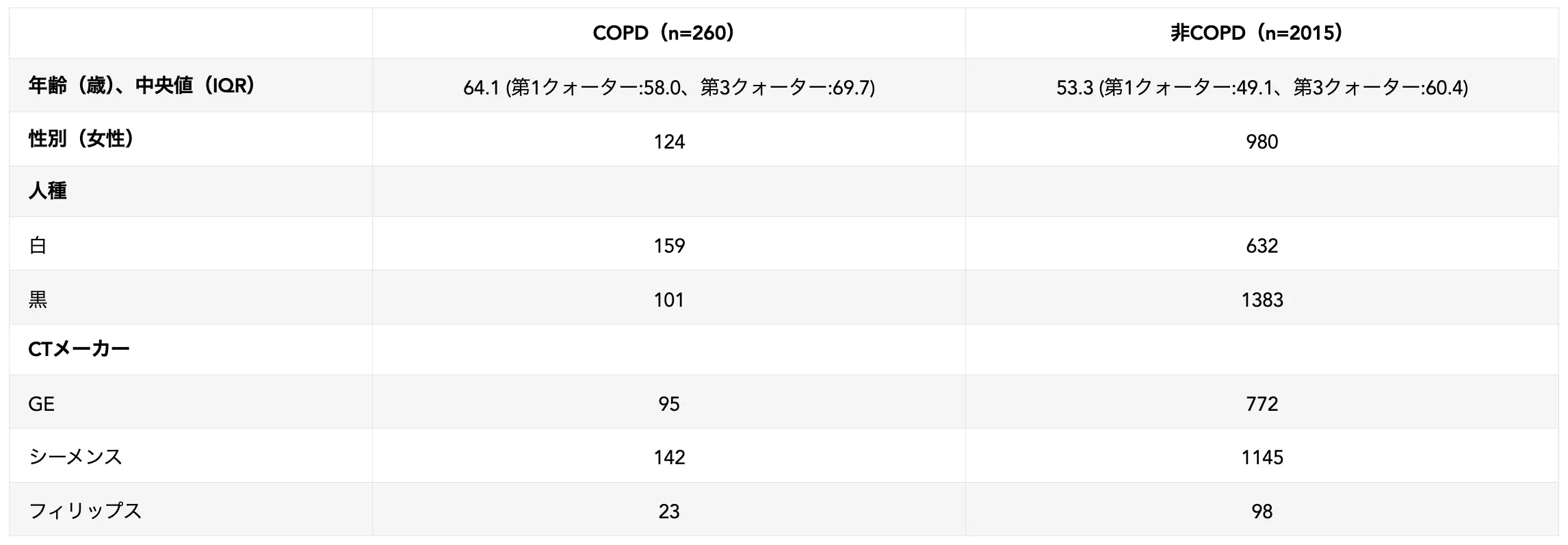 表:COPD群と非COPD群における患者背景およびCT撮像条件の比較この検証では、年齢・性別・人種といった患者背景に加え、GE、シーメンス、フィリップスといった主要CTメーカーの装置が含まれており、実臨床に近い多様な条件下で評価されていることが示されている。