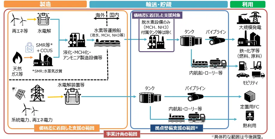 価格差支援と拠点整備支援の範囲(経済産業省 水素社会推進法資料より)